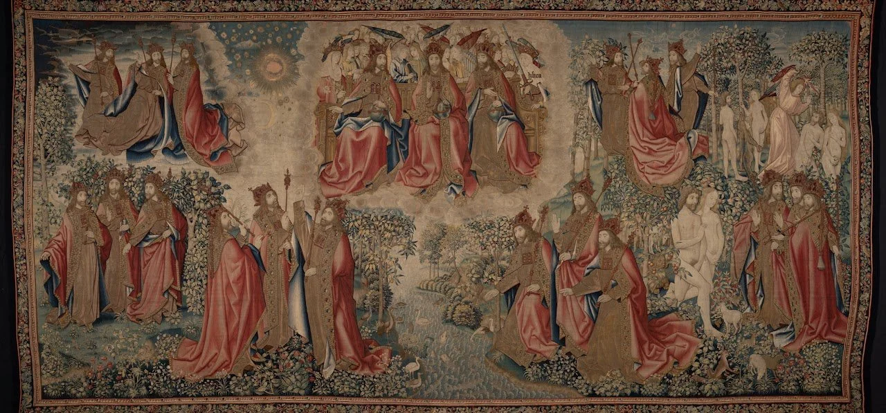 This tapestry tells the story of Adam and Eve (the nude figures shown three times on the right). The other three figures, repeated seven times, are the trinity- Father, Son, and Holy Ghost. They appear seven times to represent the seven days of Creation.